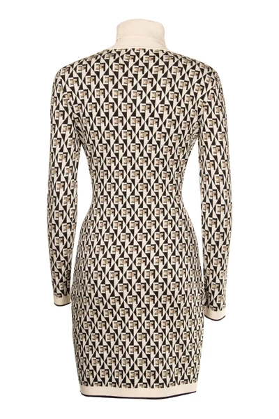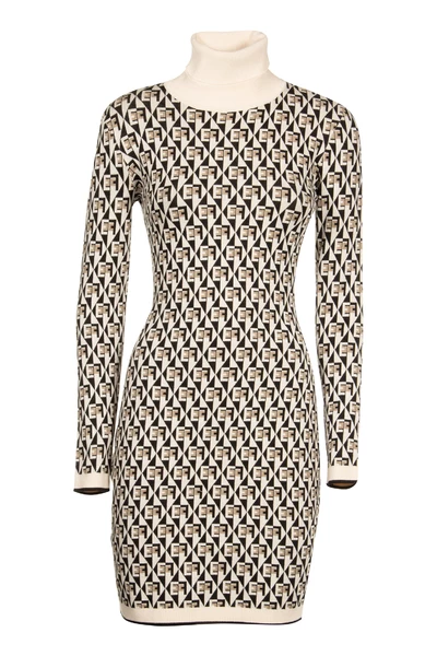 Elisabetta franchi jurken Elisabetta franchi geribbeld Turtleneck Midi -jurk mini -jurk met diamantpatroon, coltruien en lange mouwen.