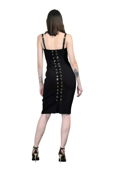Lunguette schede jurk. Zwarte kleur. Verstelbare Bretelles -pictogram Oro Plack. Porthole op de gegeven met vlees tule. Op het achterste bustier -effect met dunne gekruiste snaren. Hechtende pasvorm. Zijzip. 95%5%elastaanpolyester. Het meisje op de foto is 176 cm hoog en draagt maat 40.