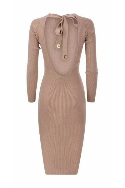 Longuette-jurk met lange mouwen, raglan gesneden en achterste halslijn met boog om aan de achterkant te binden.- Longuette jurk