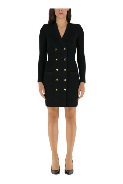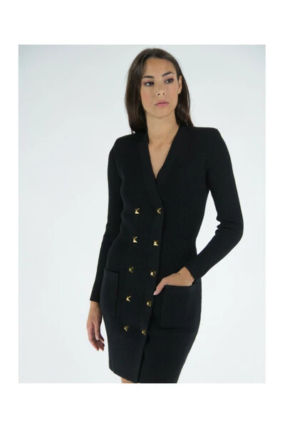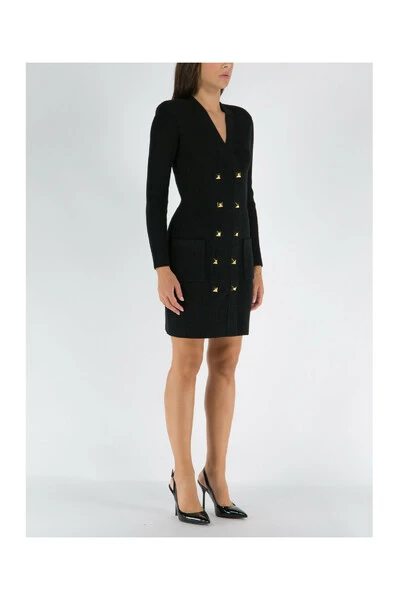 Damesjurk Elisabetta -franchi met kustverwerking in viscose gemengd. Dubbele besmet met Golden Knoppen, V. halslijn aangebrachte voorzakken. Merk: Elisabetta Franchi Artikelcode: AM39S26E2 Samenstelling: 66% viscose, 29% polyester, 5% polyamide. Pass: het model is 164 cm hoog en draagt maat 40.