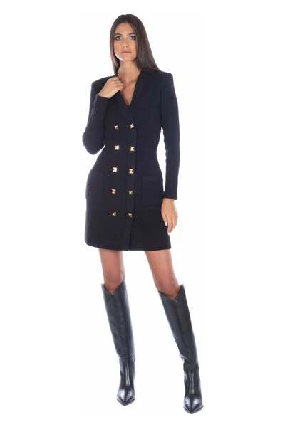 Robe Manteau Elisabetta Franchi AM39S26E2 Korte gebreide jurk met dubbele -beklaagde knopen, V -neck, schouderbanden en lange mouw. Voorafsluiting met gouden vierkante flessen. Samenstelling: 66% viscose, 29% polyester, 5% polyamide