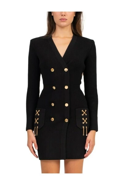 Dubbele -schepen zwarte jerseyjurk in Jearsy viscose, drukknoppen, v -neck, lange mouwen, uitgeputte, voorzakken met een decoratieve ketens, gevoerde schouderbanden 66% viscose29% polyester5% polyamide