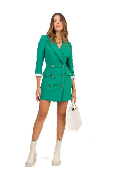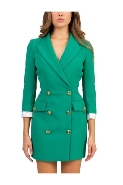 Smerald -jurk in polyester met omkering puntige halslijn, dubbele borstknopen, gouden logo, uitgeput, snijden, horizontale zakken met schaatsen en logo -knop, drie -kwart mouw met witte rand met 96% polyester 4% elastan polyester