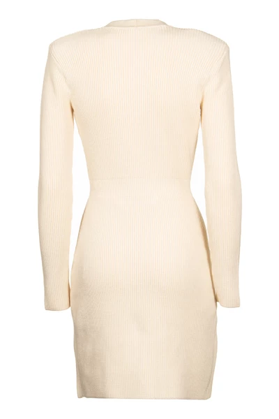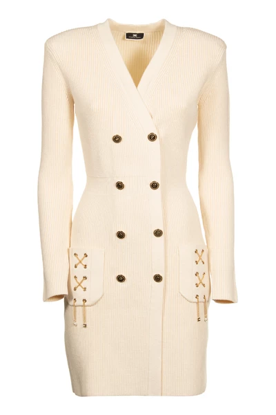 Elisabetta-franchi-jurken verse mante manteau met dubbele borsten met knooppunten, schoudervullingen en lange mouwen. Op het zakken motief Kruis van ketens met gesplitste dubbele C -uiteinden en parels. Kleur: boter gebreide mantel manteau lange mouw kruising van ketens licht gouden knopen v-neck itemsamenstelling 66% viscose 29% polyester 05% polyamide