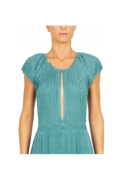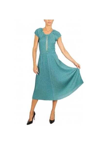 Elegante MIDI-jurk in Lurex Jersey Plissé met Cut Out Out op de halslijn Normale uitlopende rok smaragdgroene kleursamenstelling stof 80% viscose 20% polyester hoofd gedragen maat 40 Modelhoogte 1,80 cm Maat 40