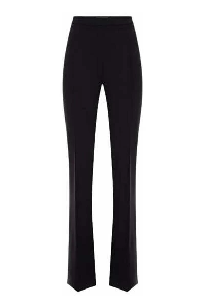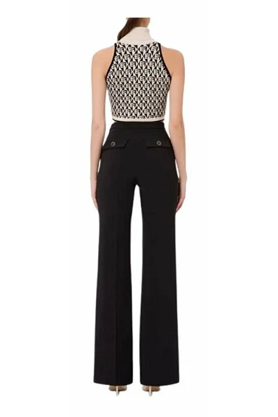 Stretch crêpe broek van de Fit to Palace door Elisabetta -franchi, fascia in het leven en snijdt in het midden. Op de achterzakken met flap met geëmailleerde knoppen in toon aan de stof die het kledingstuk aanpassen. Details pantalone bij Palazzo Stretch Life Band snijwit in de middenpoten op de achterste glazuurknoppen kabeljauw. PA00926E2