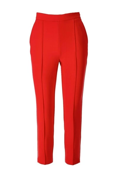 Elisabetta -franchi -broek gemaakt van rode technische stof. Franse zakken aan de zijkanten en gouden studs detail met logo aan de achterkant. Verborgen ritssluiting aan de zijkant, enkellengte.