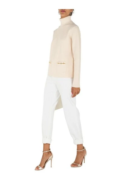Elisabetta -franchi -shirt in viscose gemengd met geribbelde verwerking. Hoge kraag en lange mouw. Zakken toegepast met Gold Logo -details. Het model draagt maat 40.