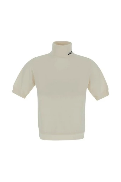 Elisabetta -franchi gebreide top in boter witte maagdwol met korte mouwen en coltrui.