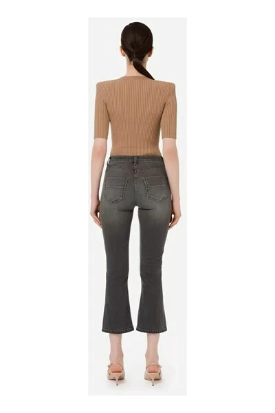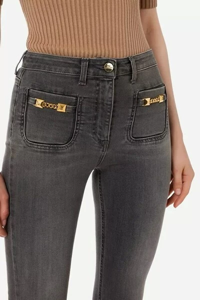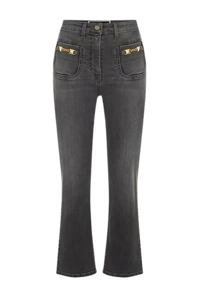 Denim broek van rookgrijs, regelmatig schieten, brede pernera, dubbele zak aan de voorkant met het aanbrengen van de nieuwe aanwijzing van tacha en gouden metalen ketting. PJ49S26E2 Technische beschrijving: denim broek hechtende maat reguliere shot dubbele zak pocket pompen type prace met logo