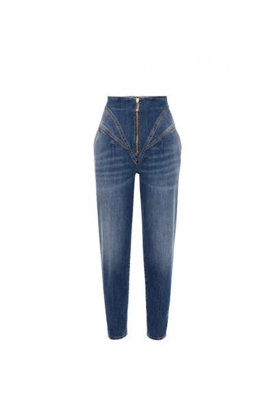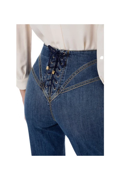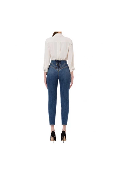 Deze wortelsnit jeans van Elisabetta Franchi in een gewassen wassing, die uw figuur omhult, heeft een veterband aan de achterkant van de broek. Stretch denim broek met hoge taille. Opvallende korsetuitsnijdingen op het bekken. Vetersluiting aan de achterkant. Metalen rits aan de voorkant. Enkellengte en zachte pijpen. Gemaakt in Italië