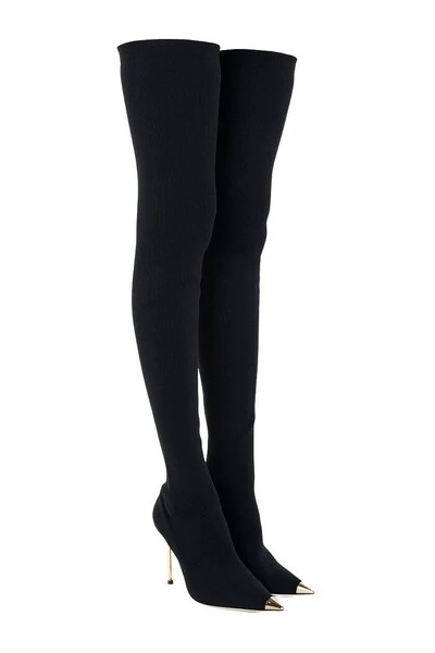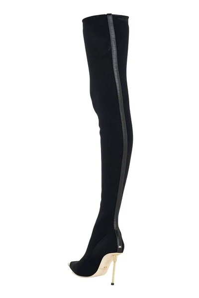 Elisabetta Franchi High Boot in Stocking in elasticized stof. Leerachtige details aan de achterkant met micro -logo. Leren interieur. Leren zool. Dunne hak 10 cm hoog.