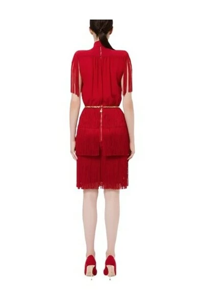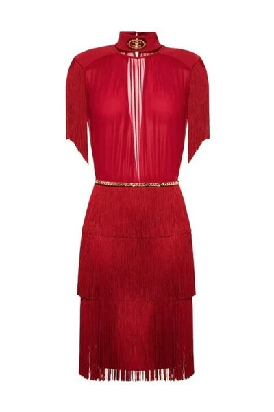 Een kuitlange jurk met een mouwloze top van georgette met een technische stoffen schouderband en kraagpatroon en franjes die vanaf de schouders over de armen naar beneden glijden. Er is een gouden metalen accessoire met een logovorm in een ovaal oppervlak bedekt met micro studs.
