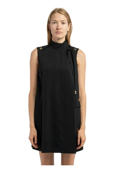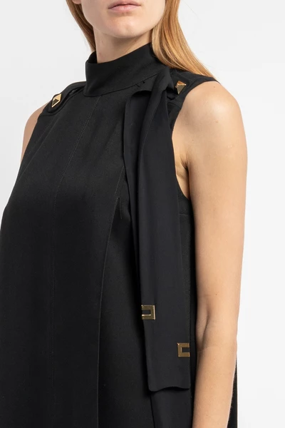 Elisabetta -franchi -jurken zwarte korte jurk, mouwloos in stevige crêpe met een wijd uitlopende lijn aan de onderkant, gekenmerkt door een motief van grote platte plooien aan de voorkant en een sjaal die verbindt aan de nek verfraaid met kleine logo -platen in gouden metaal. Kleine wapenschriften sieren het schouderpunt. Aan de achterkant overwint een brede halslijn de diepe vouw.