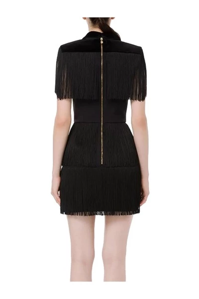 Robe manteau jurk in dubbele crêpe met fluweel inzetstukken op schouders en revers. Schouderriem met franjes die de armen naar achteren sieren. Mini -rok volledig bedekt met twee omzoomde stroom die beweging geven tijdens het lopen. In de snede van de taille worden twee fluwelen flappen op de voorkant geplaatst met metalen logo -plaques en studs. • Geslokte manteljurk met franjes • Dubbele crêpe • Velvet inzetstukken • Rok met franjesstroom • Velvet flappen • Logo metalen platen