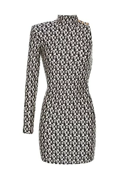 Diamantpatroon bedrukte lycra -jurk, asymmetrisch met hoge kraag vastgemaakt op de schouder met gouden EF -logo -knoppen, handschoenhuls aan de ene kant en mouwloos aan de andere kant. Opening die de achterkant openbaart.