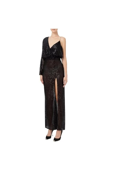 Rode loperjurk in pailletten, asymmetrisch, met batwing -mouwen die de bovenkant kruist met een bratelline van setstenen aan de voorkant. De wijd uitlopende rok heeft een diepe spleet in de zijkant en een kleine staart aan de achterkant. • Rode loper -jurk • Lovertegrendstof • Asymmetrisch met Batwing -mouwen • Banden met ingestelde stenen • Snijd in de zijkant