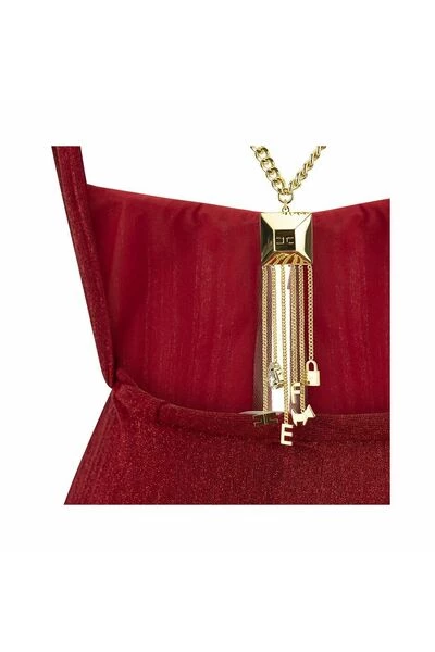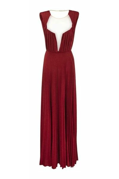 Rode loperjurk in Lurex Jersey met kleine schouders, brede halslijn met diepe V, allemaal verzameld. De geplooide rok bestaat uit drie panelen die twee zijspleulen creëren. Een goudhanger-accessoire valt op op de kale achterkant.- Rode loperjurk