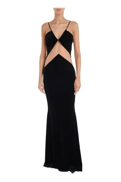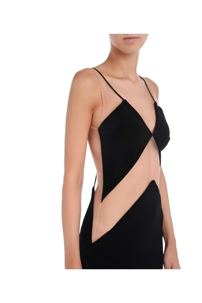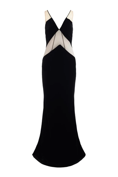 Fluwelen jurk met transparante tule inzetstukken.