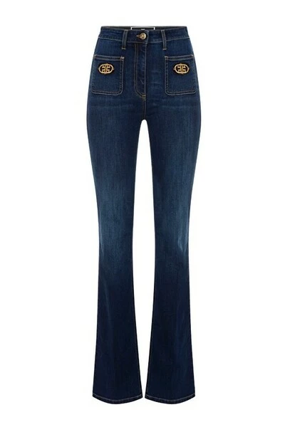 Lange impactbroeken gemaakt van stretch denim, normale taille, met zakken aan de voorkant, versierd met een logo -badge met microklivetten die in een garen borduurwerk worden geplaatst.