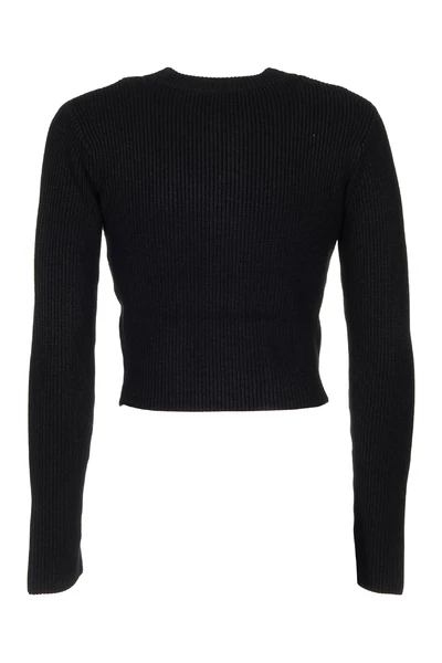 Elisabetta-franchi truien zwart geribbeld vest met ritssluiting zwart, geribbelde gebreide, paardenbit-detail, goudkleurige logo-plaquette, ronde halslijn, zipafsluiting vooraan, lange mouwen en gewasontwerp.