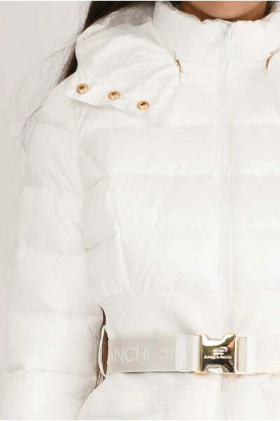 Gewatteerd jack met afneembare capuchon, automatische knopen en ritssluiting en riem met logosluiting. Gemaakt in Italië.