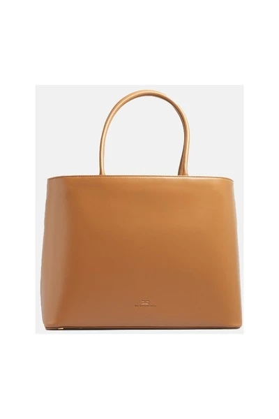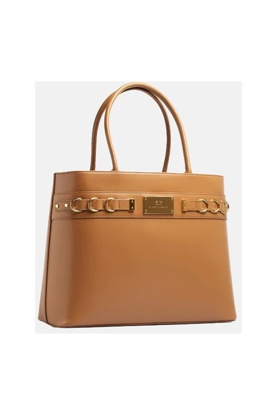 Grote zwarte shopper van geborsteld kunstleer van Elisabetta Franchi met motief op de voorkant met logoplaatje, ringen en afneembare ophangtas in lichtgoud, breed handvat, afneembare interne clutch, logomotief in goudplaatje Samenstelling: 100% kunstleer Afmetingen: 38 x 30 x 15 cm F/W 21 collectie