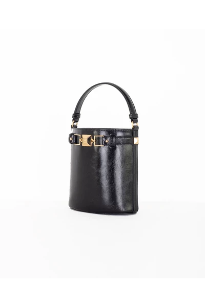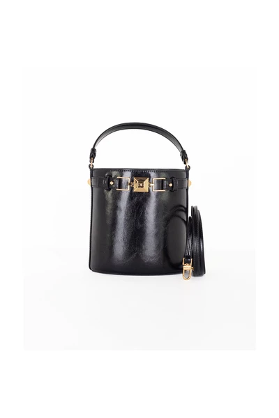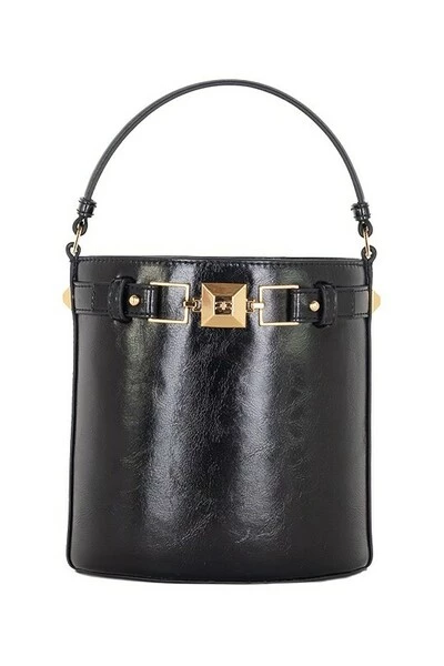 Kleine emmer Elisabetta -franchi in verf. Bombed Single Handle en verwijderbare verfschouderriem. Diamant bezaaid detail met licht goud metalen logo. Sluiting met flap en magneet (18x17x10cm)