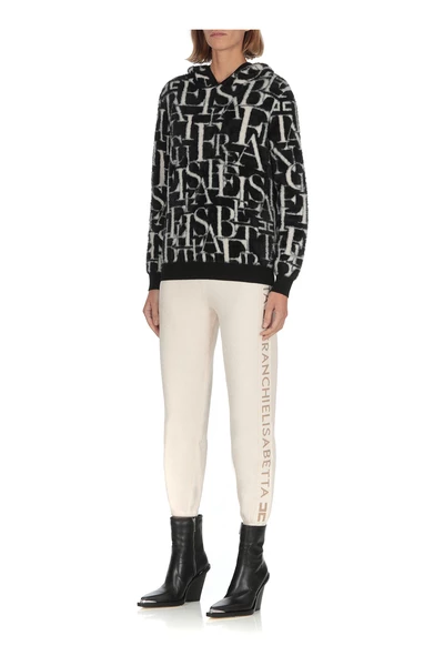 Elisabetta Franchi – Black Elisabetta Franchi Tricot Sweater voor vrouw – Fixed Hood – Lange mouwen – All -Over Elisabetta Franchi Logo – Elastische geribbelde manchetten en zoom