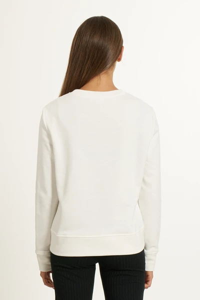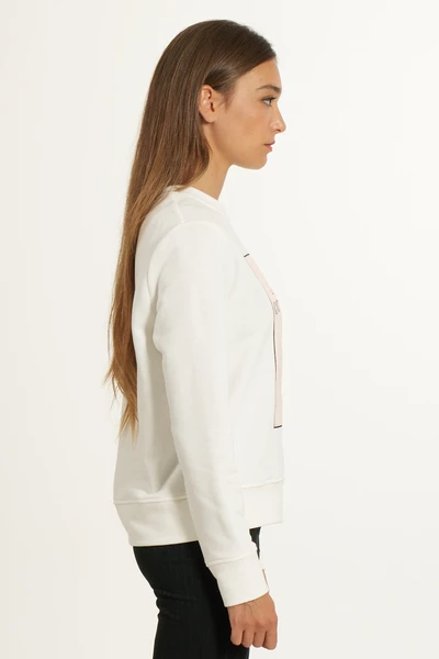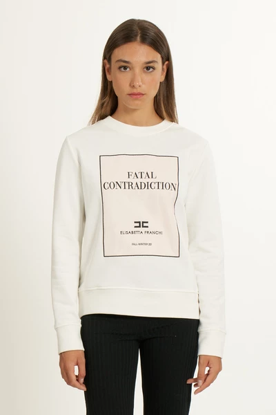Elisabetta franchi sweatshirt, bemanningsmodel, lange mouwen, contrast borduurwerk aan de voorkant, Organza -paneel met het schrijven? Fatale tegenstrijdigheid? en de ef. Het model is 1,69 cm hoog, draagt maat 40collezione A/I22