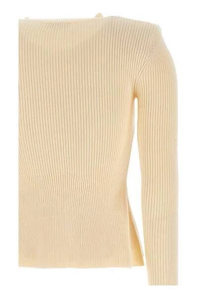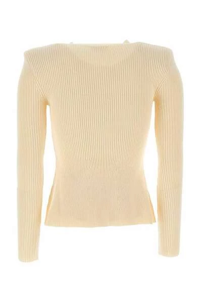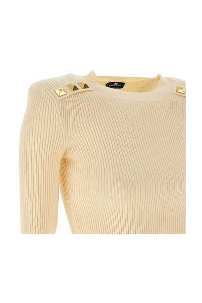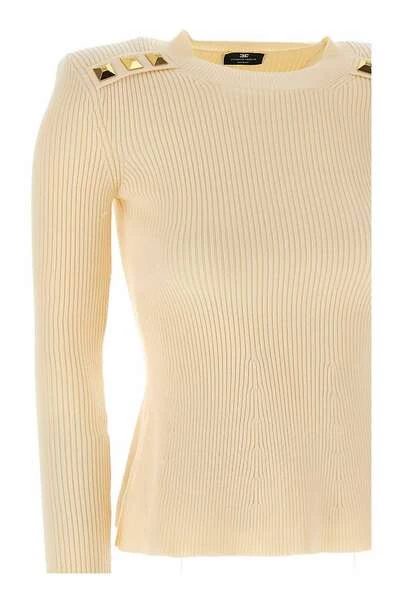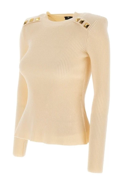 Elisabetta Franchi Sweaters Witte Elisabetta Franchi Women s trui, wit, bemanningsleden, zomen en geribbelde afwerking, met riemen, lange mouwen, laaide aan de onderkant en volgorde van gouden metalen knopen op de schouders, ideaal voor de herfst- en winterseizoen .