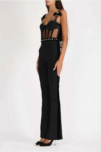 Dubbellaagse jumpsuit van Elisabetta Franchi. Dit model heeft een bustier top, met fluwelen bies versierd met afwisselend goudkleurige metalen studs en parels, twee kleine strikjes bovenaan. De broek is licht uitlopend aan de onderkant en versierd in de taille met een fluwelen band.