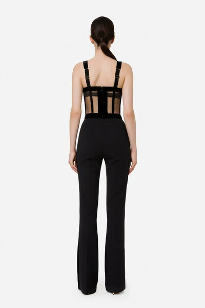 Gouden metalen studs met parels. Uitlopende broek. Strakke pasvorm.