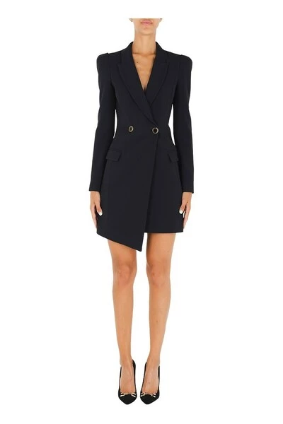 Jurk met lange mouwen, gewatteerde schoudervullingen en V-hals met revers. Faux zakken met klep. Asymmetrische korte snit. Double-breasted sluiting met logoknopen.