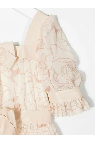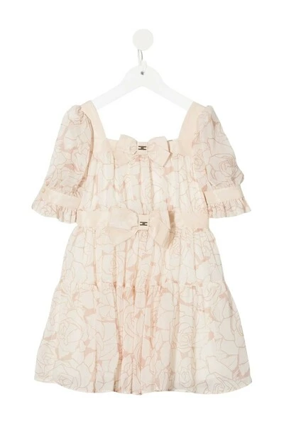 Elisabetta franchi jurken beige jurk, bloemenprint, vierkante nek, korte mouwen ; Buiten: polyester 100%, polyamide 100% voering: viscose 67%, polyester 33% ;