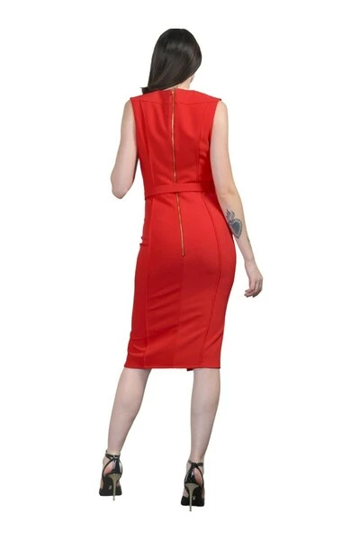 Dimanicate schede jurk. Kus rode kleur. V. Pyramidal Studs. Stoffengordel met Gold Logo Buckle. Ritssluiting. 95%5%elastaanpolyester. Gemaakt in Italië.
