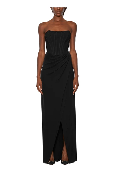 Vloeiende jersey Red Carpet jurk met botten op het lijfje en korsetachtige tuleconstructie aan de binnenkant. Gedrapeerde rok die op de zijkant rust waardoor een diepe split ontstaat.