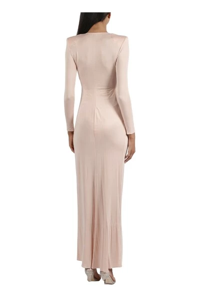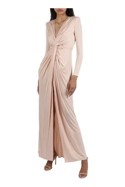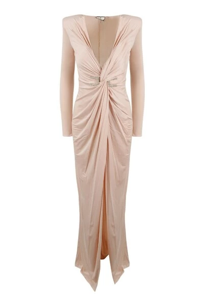 Jurk met schoudervullingen, lange mouwen, drapering en knoop in de taille.