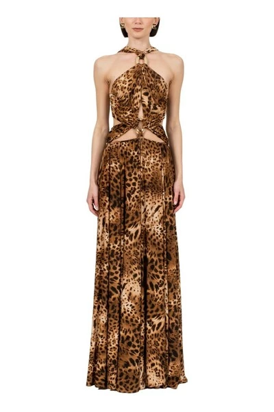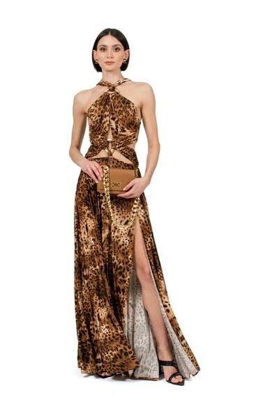 Lange jersey jurk cupro maculed printen, gekenmerkt door een gearticuleerde drape gemaakt van kruisingen onthouden door gouden metalen ringen met een brede rok die opent in een diepe zijspleet, rits op de achtergrond retro tot 83% cupro 17% elast