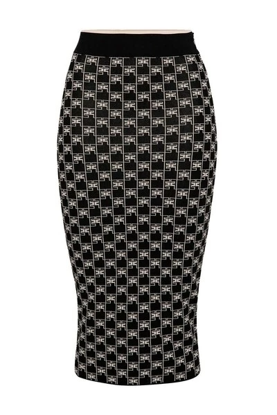 Rok van viscosemix met contrasterend monogrammotief. Elastische tailleband en blinde ritssluiting.