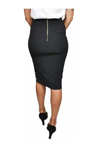 Rok van Elisabetta Franchi ontworpen voor een verfijnde, elegante en vrouwelijke vrouw. Rok van zachte, zwarte, elastische technische stof. Zijsplit met bronzen knopen. Gouden ritssluiting op de rug. Aanhangend model met lengte onder de knie.