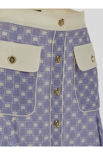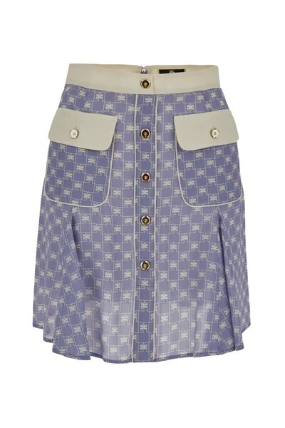 Paarse/witte high-taille geplooide rok van Elisabetta-franchi met all-over logo-print, hoge taille, knoopbevestiging, plooiendetails, wijd uitlopen, twee knoopvakken en dijengte.