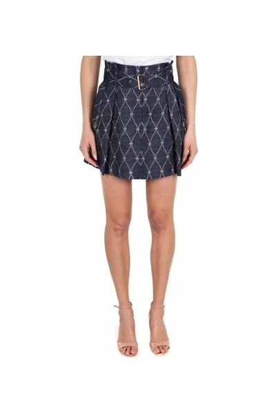 Korte ballonrok met mooie stof riem denim effect detail zijzakken gladde kleur blauwe compositie stof 48% katoen 52% polyester hoofd gedragen maat 40 modelhoogte 1,80 cm maat 40
