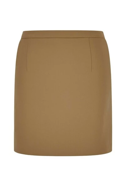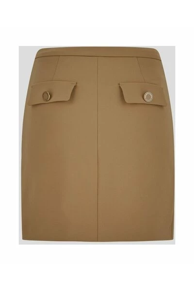 Elisabetta franchi minirok in kameel gekleurd polyester met voorkleppen met logo -bottons.