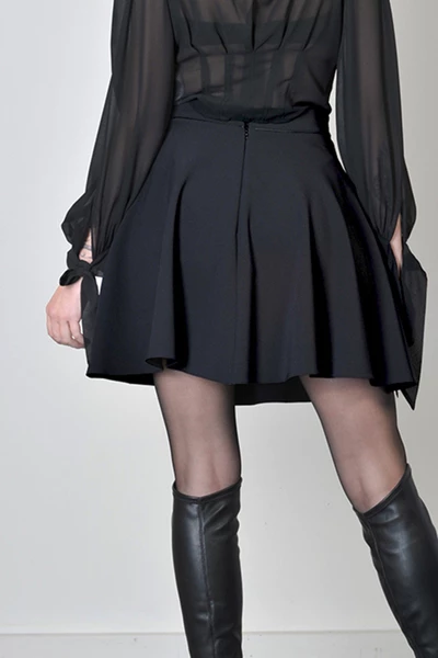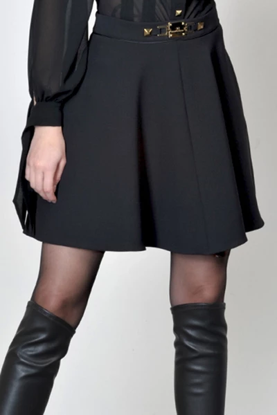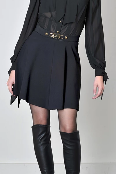 Korte rok op wiel. Zwarte kleur. Life Band. Satijnen leidingen. Klem met klem. Piramidale studs. Zakken in de zijkant. Zip in het midden achter. 96%4%elastaanpolyester. De persoon op de foto is 176 cm lang, draagt maat 40.