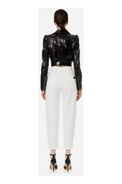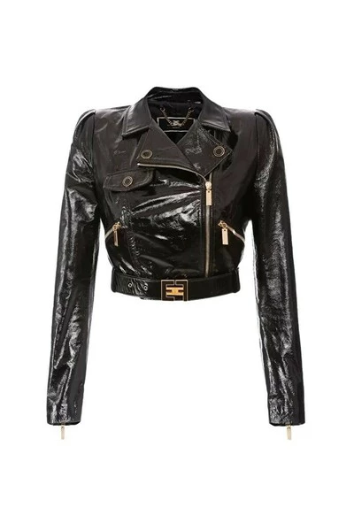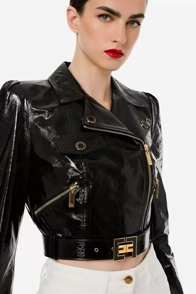 Korte motorjack, hechten aan helder lakleer met een riem gekenmerkt door een gesp met geëmailleerd metalen logo, asymmetrische sluiting met gouden metalen rits en ritszakken aan de zijkanten. GD22Z26E2 TECHNISCHE BESCHRIJVING: Korte korte motorjack Houdige gesp met geëmailleerde logo symmetrische sluiting met rits samenstelling: 100 % leer