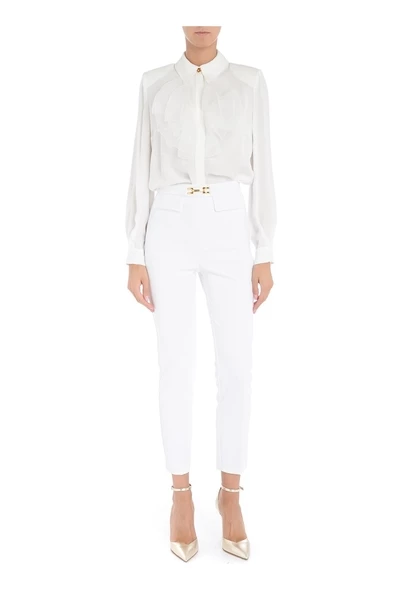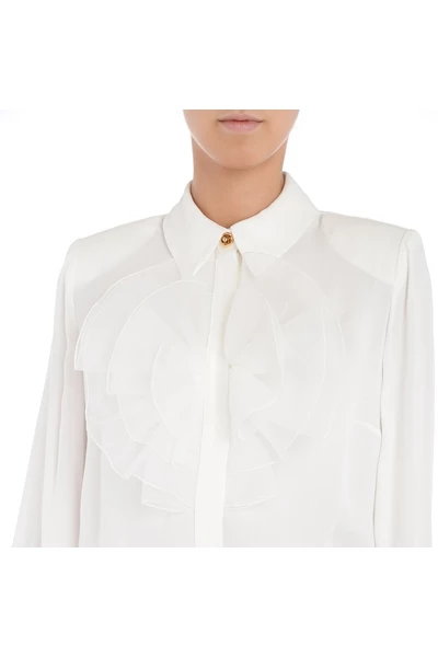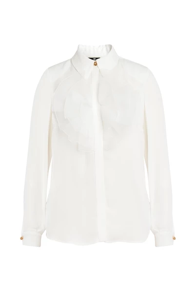 Losvallende blouse met lange mouwen van viscose-georgette, aan de voorkant versierd met een maxiroos van organza in bijpassende tint.