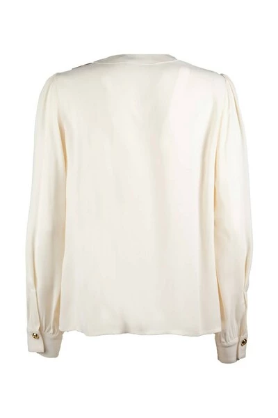 Elisabetta-franchi-shirt gemaakt van boterkleurige viscose-georgette, met een v-hals en licht gepofte schouder met logo-metalen detail. Patchvakken op de voorste en knoopafsluiting. Rechte pasvorm.