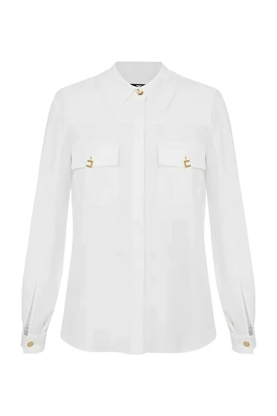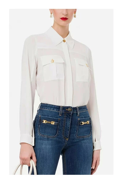 Lange sleeveved shirt gemaakt van georgette met lange mouwen en kenmerkend door grote zakken met flap en logo hanger gemaakt van gouden metaal. Merk: Elisabetta Franchi Artikelcode: CA01626E2 Samenstelling: 100% polyester. Pass: het model is 178 cm hoog en draagt maat 40.