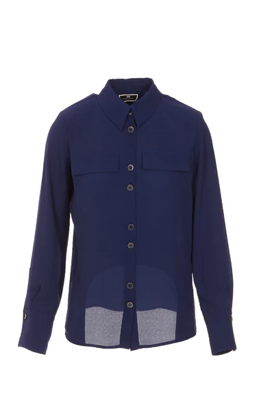 Blauw overhemd, frontale knoopsluiting, clic kraag, knoop op de manchetten, verstevigde schouder.